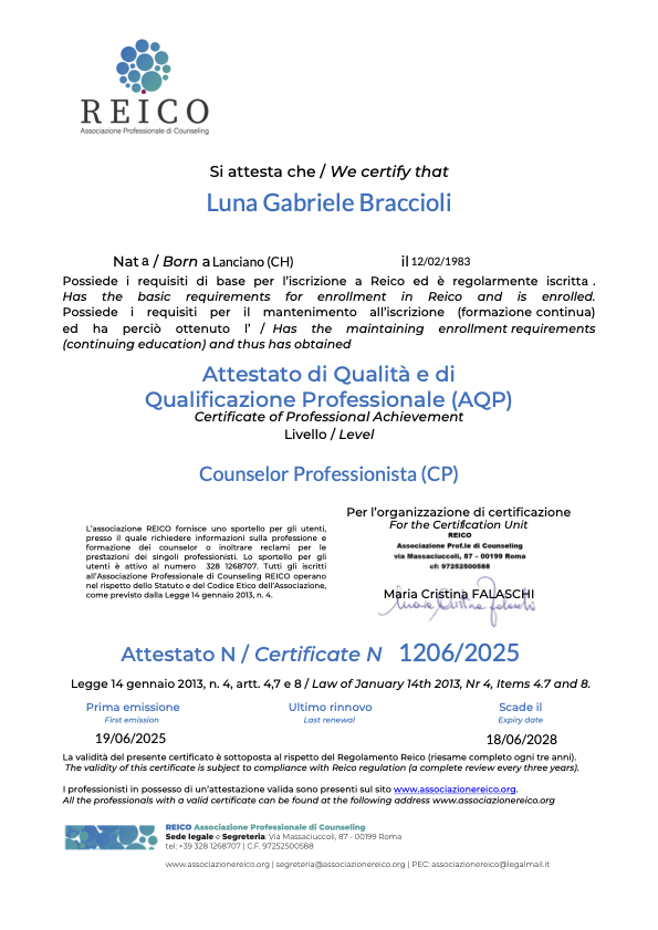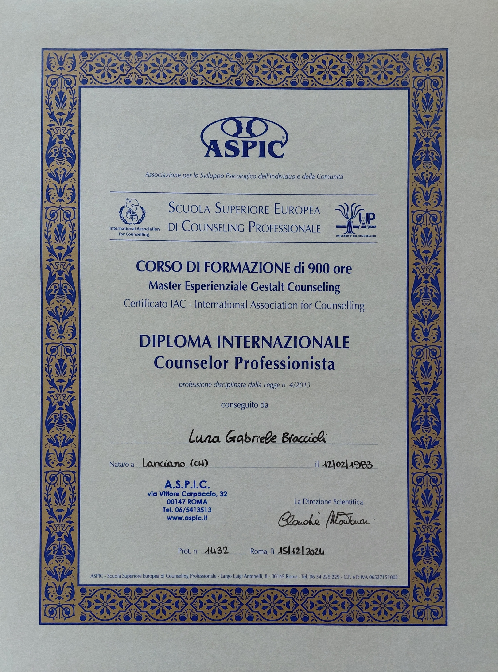 Dopo il master in Gestalt Counseling presso ASPIC e il perfezionamento in counseling di gruppo, accompagno le persone in percorsi individuali online.